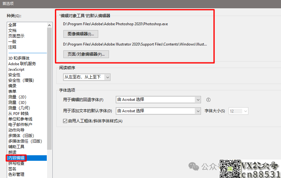 若在Adobe DC中编辑图片或矢量图,则要配合Adobe Photoshop和Adobe Illustrator软件使用,需要在电脑上安装这2款软件,Adobe DC会自动识别软件目录,若没有自动识别,需要在设置中配置软件路径。步骤如下:打开首选项,点击内容编辑,在默认编辑器处配置软件路径即可,如下图: