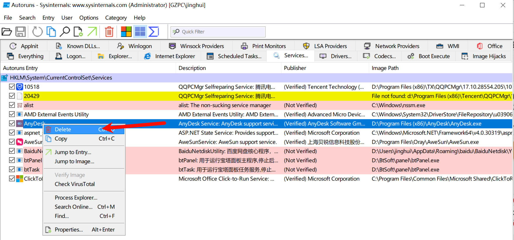 2.右键可以直接删除对应的注册表项目菜单上的项目,包括了启动,服务,驱动,解码等等。