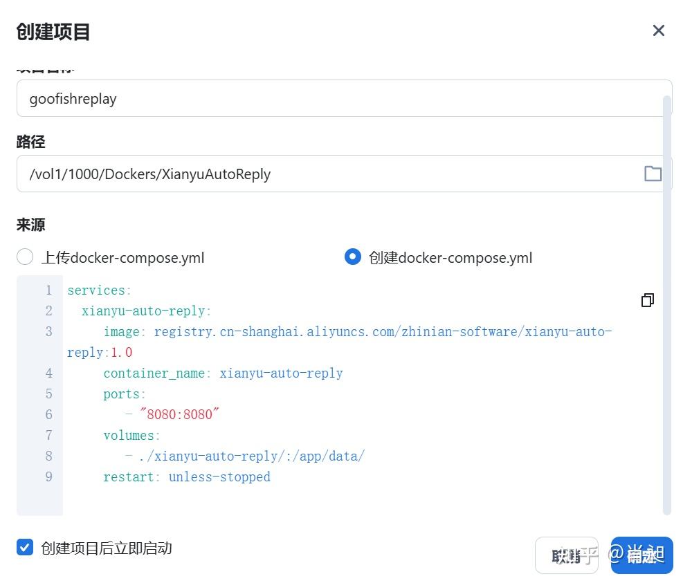 2. 创建项目页面把上面 docker-compose.yml 内容复制后点击确定进行部署
