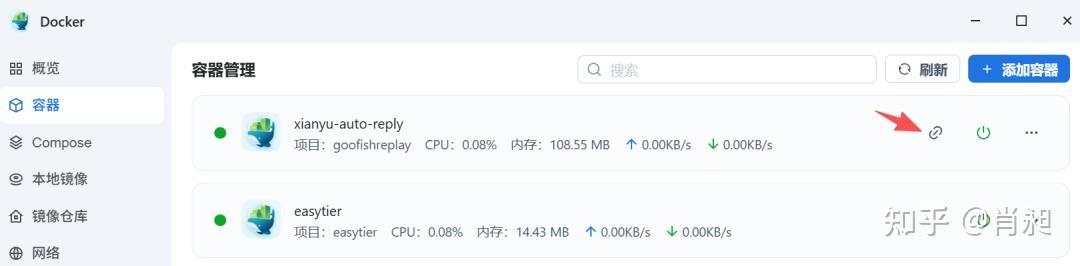 3. 在容器菜单可以看到运行情况,点击 xianyu-auto-reply 右侧链接即可打开