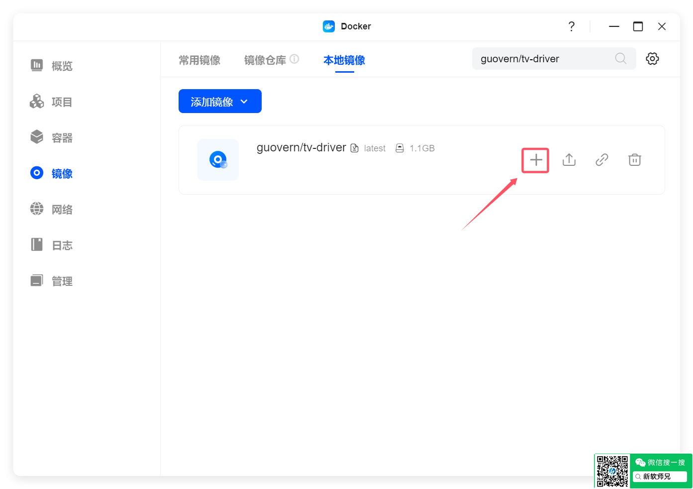 导入完成以后,搜索tv项目,点击+按钮创建容器。