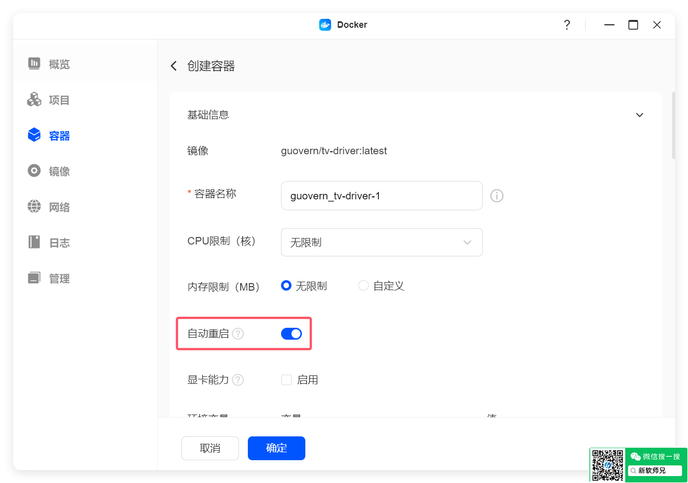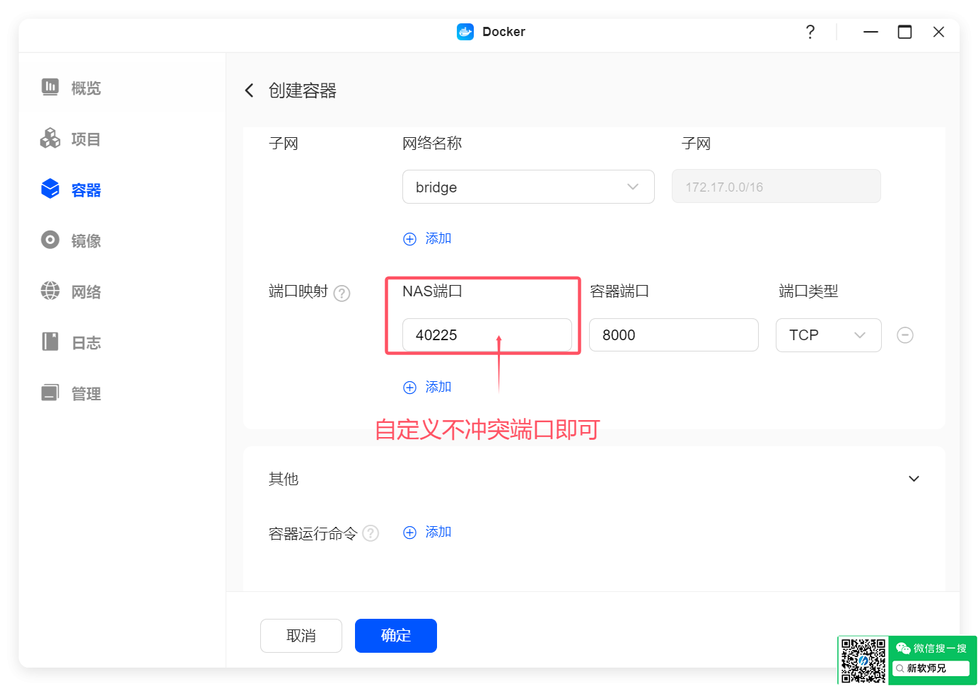 端口方面,容器默认的是8000端口,NAS端口可自定义。