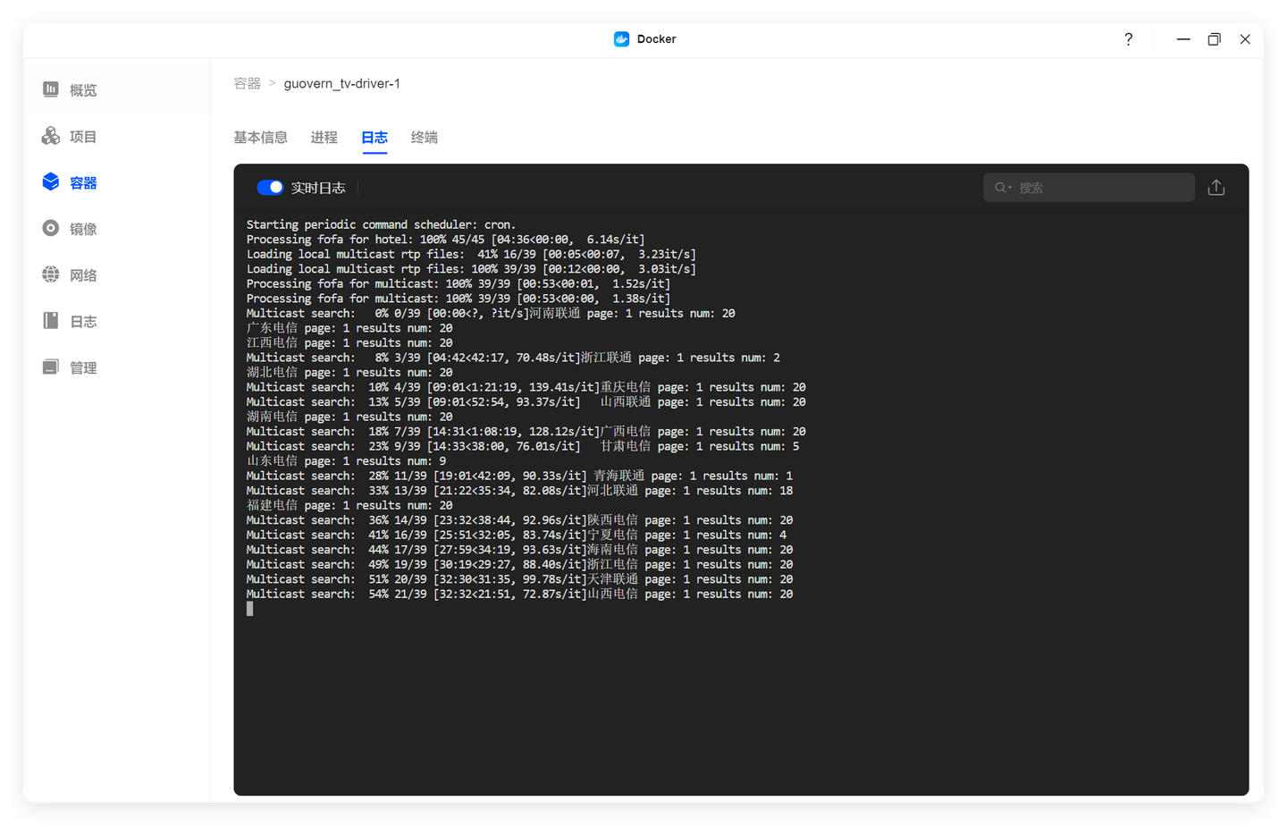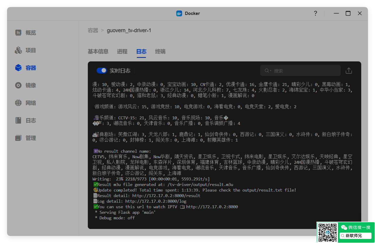 打开绿联的docker应用,在日志里可以看到容器正在更新IPTV链接。