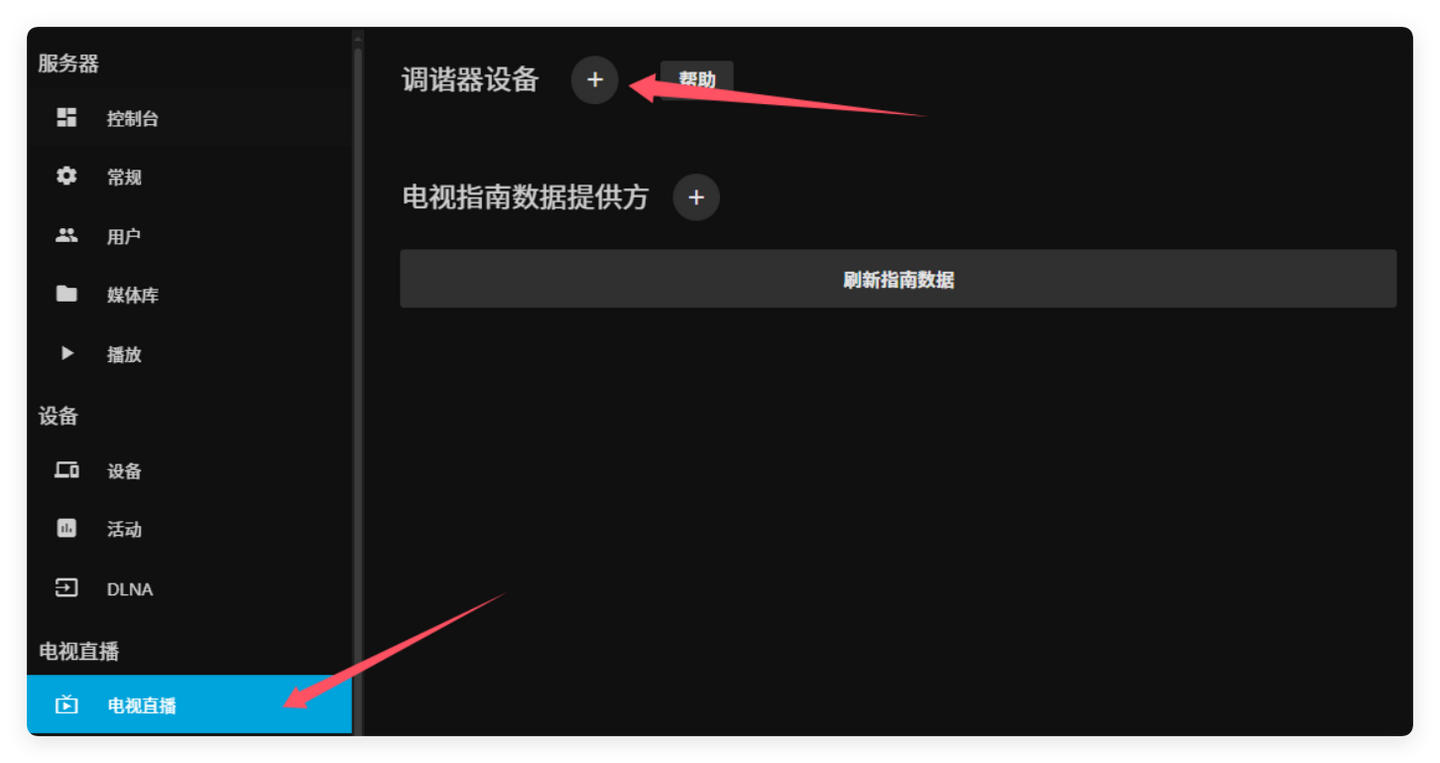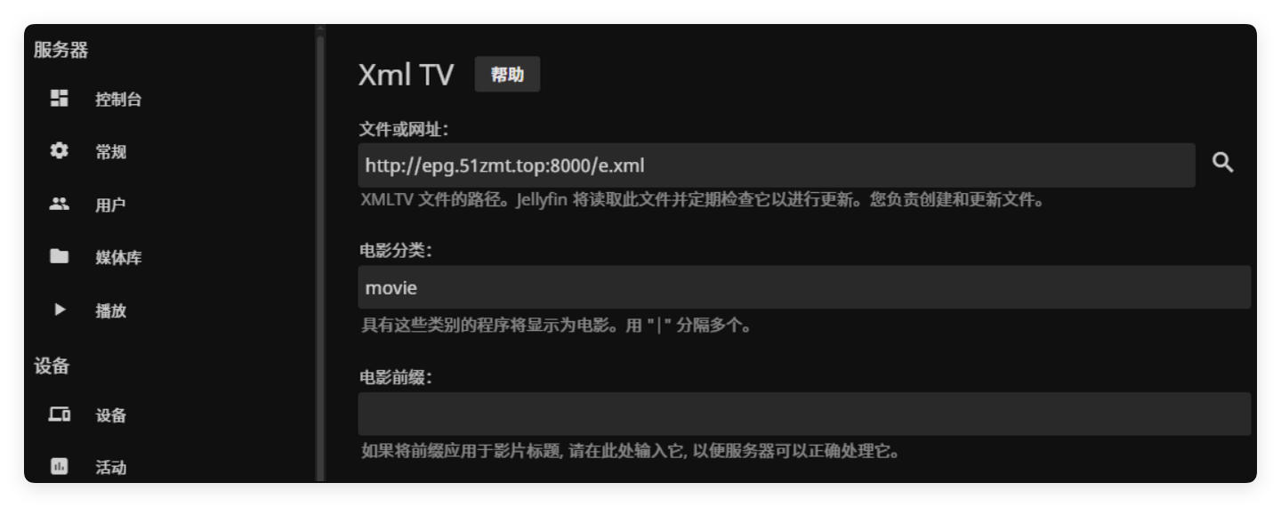 在电视机上也可以同样的进行操作,安装比如TVbox/jellyfin等类似的APP进行操作。在Jellyfin页面中,选择控制台-电视直播,调谐器设备增加URL。