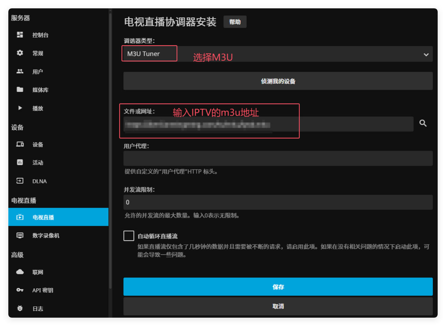 选择M3U Tuner,在下方输入IPTV的m3u地址。