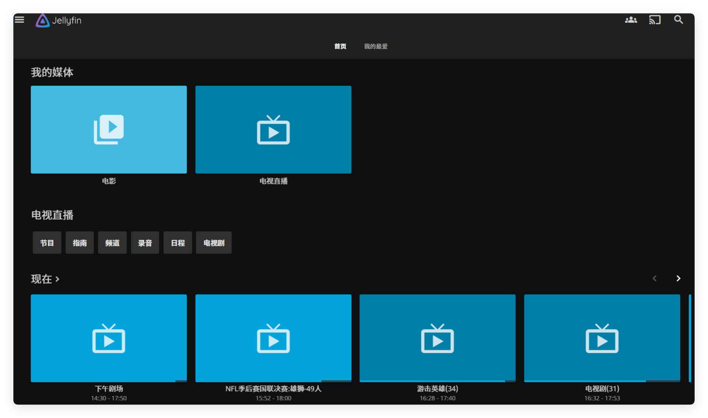 初次刷新EPG会需要一段时间,等刷新完成以后,我们就可以在jellyfin首页看到电视节目单了。